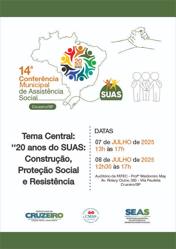 A Secretaria de Assistência Social (SEAS) e o Conselho Municipal de Assistência Social (CMAS), em parceria com a Prefeitura Municipal de Cruzeiro, realizarão a Conferência Municipal de Assistência Social. O evento, com o tema “20 anos do SUAS: Construção, Proteção Social e Resistência”, ocorrerá nos dias 7 e 8 de julho, no auditório da Fatec – Prof. Waldomiro May, no município de Cruzeiro.