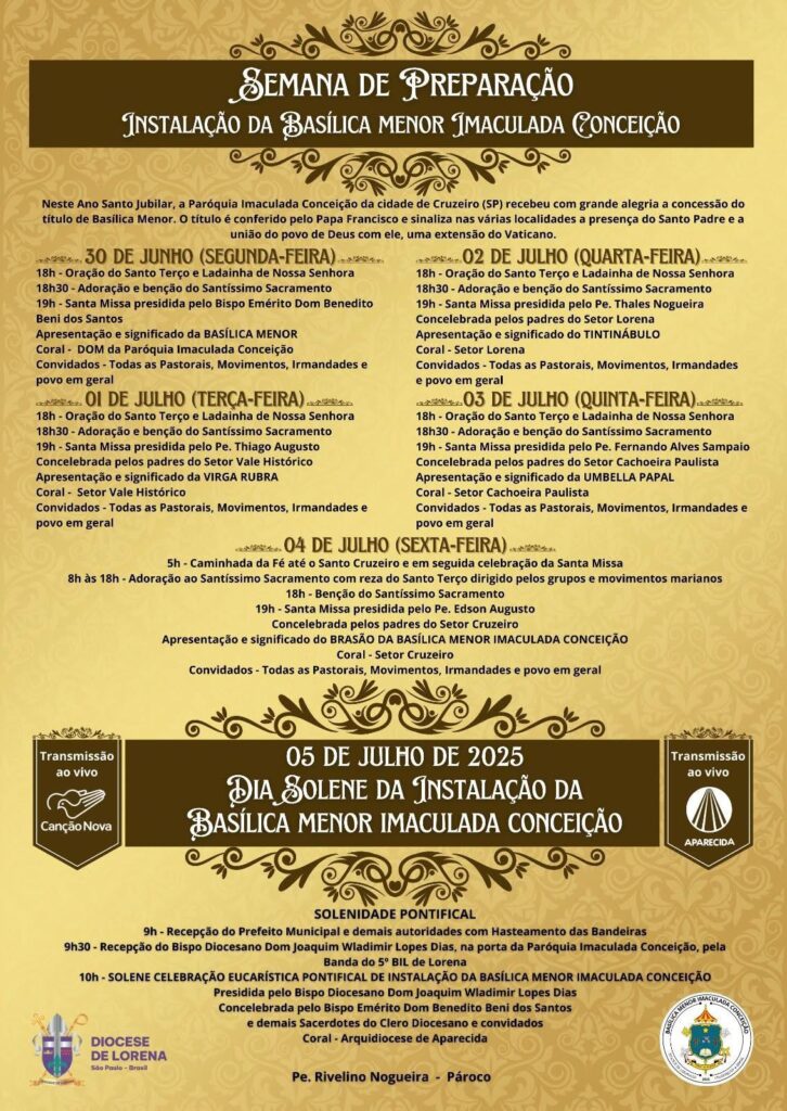 A Paróquia Imaculada Conceição, localizada em Cruzeiro/SP, na Diocese de Lorena/SP, se prepara para ser oficialmente instalada como Basílica Menor, um título concedido pelo Papa. O reconhecimento é uma homenagem à sua relevância na vida litúrgica e pastoral, além de simbolizar um vínculo especial com a Igreja de Roma.