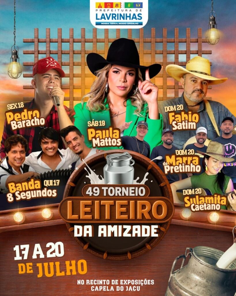 A Prefeitura de Lavrinhas/SP divulgou a programação oficial da 49ª edição do Torneio Leiteiro. O evento será realizado entre os dias 17 e 20 de julho, com atividades programadas para os quatro dias. A abertura dos portões está marcada para as 19h, e os shows têm início às 23h. No domingo, dia 20, as atividades começam ao meio-dia.