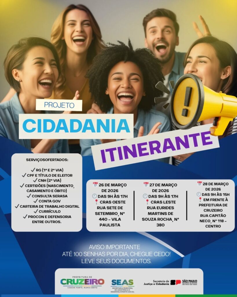 A Prefeitura de Cruzeiro, em parceria com a Secretaria da Justiça e Cidadania do Estado de São Paulo, recebe entre os dias 26 e 28 de março o Projeto Cidadania Itinerante, com a oferta de diversos serviços gratuitos à população.
