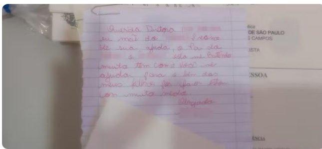 Na mensagem, entregue pelo menino de cinco anos à direção da escola, a mulher, que na época tinha 23 anos, escreveu: “Querida diretora, preciso de sua ajuda. O pai do meu filho está me batendo muito. Tem como você me ajudar? Para o bem dos meus filhos, por favor. Estou com muito medo”.