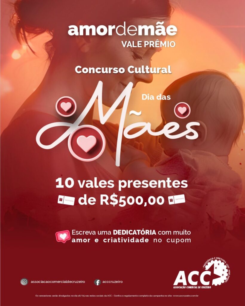 A Associação Comercial de Cruzeiro anunciou uma nova promoção em comemoração ao Dia das Mães. A ação é o concurso cultural “Amor de Mãe Vale Prêmio”, que será realizado entre os dias 27 de abril e 10 de maio.
