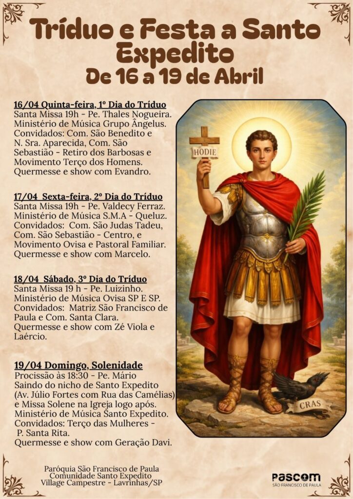 A comunidade católica de Lavrinhas inicia nesta quinta-feira (16) o tríduo em honra a Santo Expedito, na Paróquia de São Francisco de Paula, localizada no bairro Village Campestre.